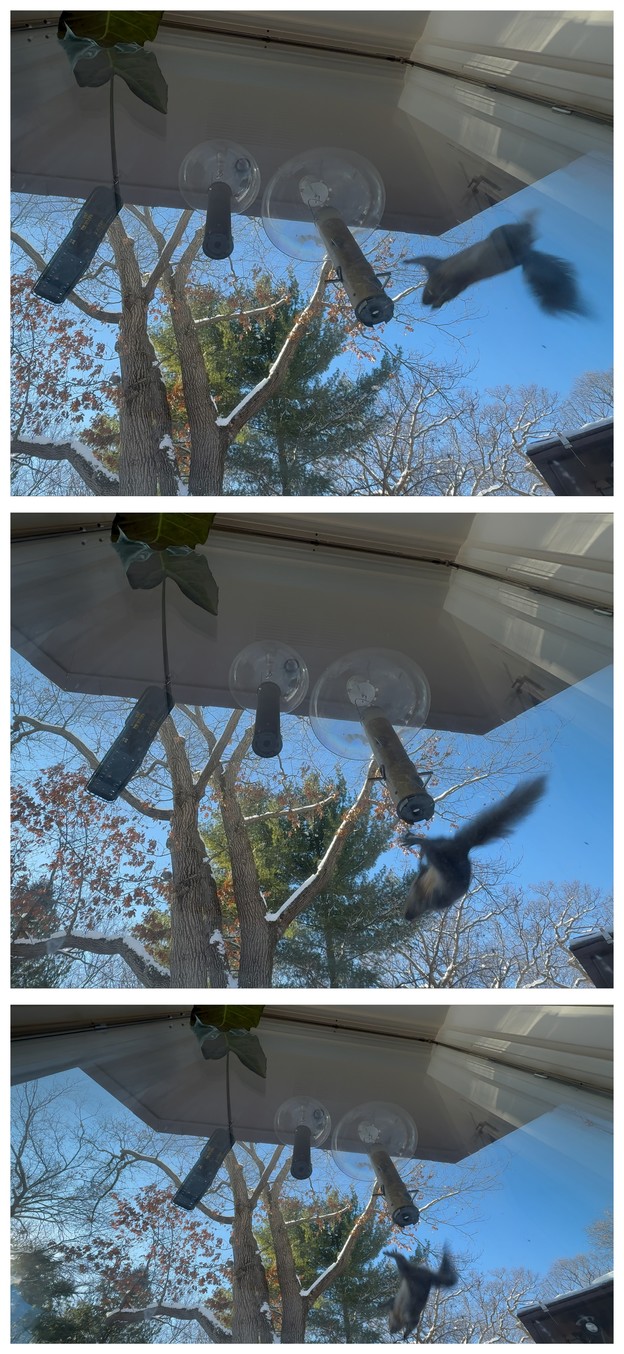 It's aggravating, Cheryl.  The website's system supplanted my previous collage of squiirel-in-flight freeze-frames with this, which is three views of my hastily constructed countermeasure.  It's meant to take advantageous leaping angles away from the squirrel.